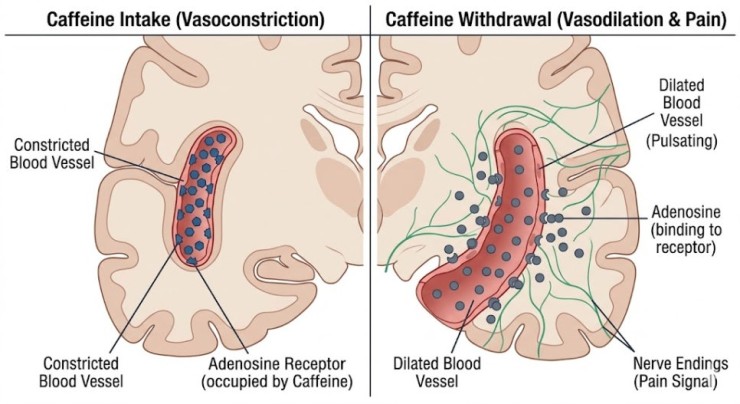 즉, 카페인이 없으면 아데노신이 과도하게 작용하여 피로와 함께 뇌혈관 확장을 유발하고,