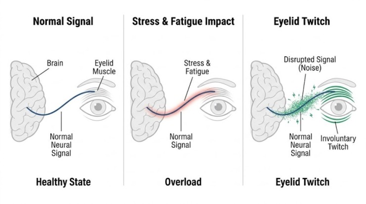 하지만 스트레스와 피로가 쌓이면 교감 신경이 과도하게 활성화되어 이 신경망에 '잡음'이 끼어들게 됩니다. 마치 라디오 주파수가 불안정해지면 지직거리는 소리가 나는 것처럼, 신경 세포들이 불필요한 신호를 과도하게 보내기 시작하면서 눈꺼풀 근육이 의지와 상관없이 수축하는 현상이 나타나는 겁니다.