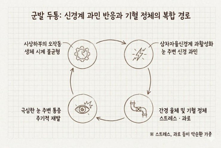 한의학적 관점에서 저는 군발 두통을 '담화요동(痰火擾動)' 혹은 '간담울화(肝膽鬱火)'로 인한 기혈 순환의 불균형으로 봅니다. 스트레스, 과로, 불규칙한 생활 등이 간의 기운을 울체시키고, 이로 인해 열이 발생하여 머리 쪽으로 치솟으면서 특정 경락, 특히 눈 주위의 신경과 혈관에 영향을 미친다고 해석하는 것이지요.