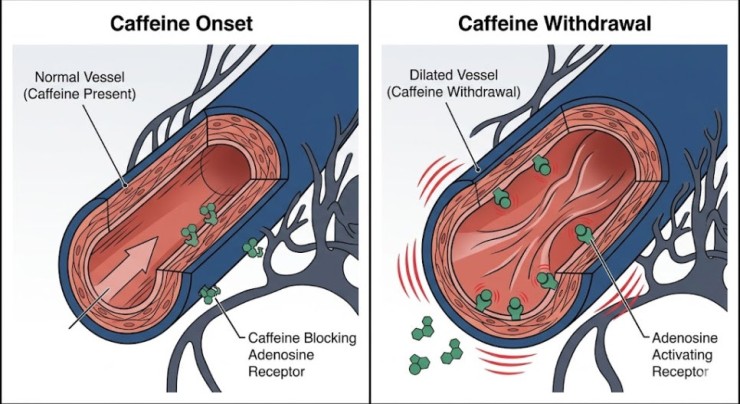 이때 혈관 주변의 신경을 자극하여 욱신거리는 통증, 즉 카페인 금단 두통을 유발하는 것입니다.