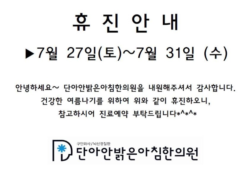 2019년 7월 여름휴가 안내 페이지 정보 조회260회 작성일 19-07-19 19:36 목록 이전글2019년 추석연휴 휴진안내 19.09.04 다음글2019년 6월 공휴일 진료안내 19.05.28