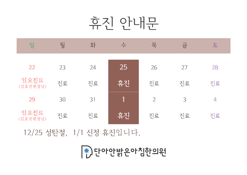 2019년 성탄절, 신정 휴진 안내 페이지 정보 조회259회 작성일 19-12-23 12:20 목록 이전글2020년 점심시간 변경안내 19.12.26 다음글2019년 10월 공휴일 진료안내 19.09.30