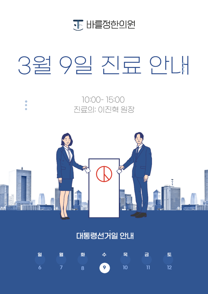 대통령선거일 진료안내 페이지 정보 조회266회 작성일 22-03-03 10:33 목록 이전글근로자의 날(5/1일) 휴진 안내 22.04.30 다음글2021년 성탄절, 2022년 신정 진료안내 21.12.30