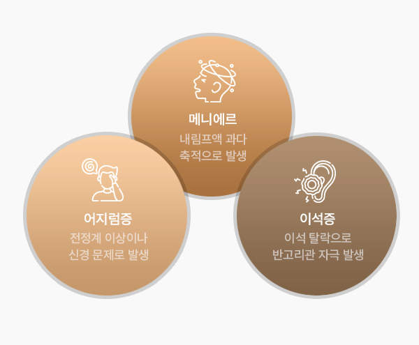 메니에르, 어지럼, 이석증은 귀와 뇌신경계 이상에 따른 복합 원인과 재발이 잦은 질환입니다.