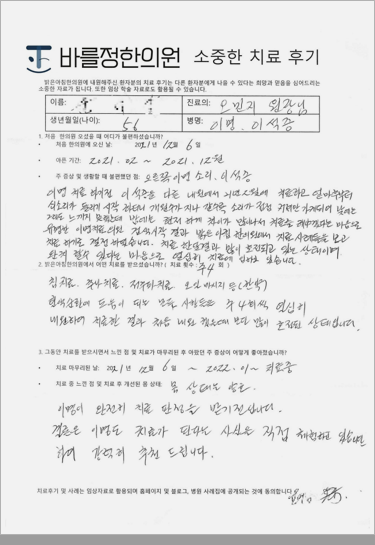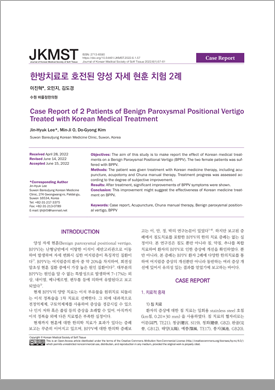 2022년 대한침도의학회지를 통해 발표한 논문으로, 이석증 한방치료 후 어지럼증 및 그 외 이석증 관련 제방 증상이 거의 소실되어 유의미한 효과를 입증하였습니다.