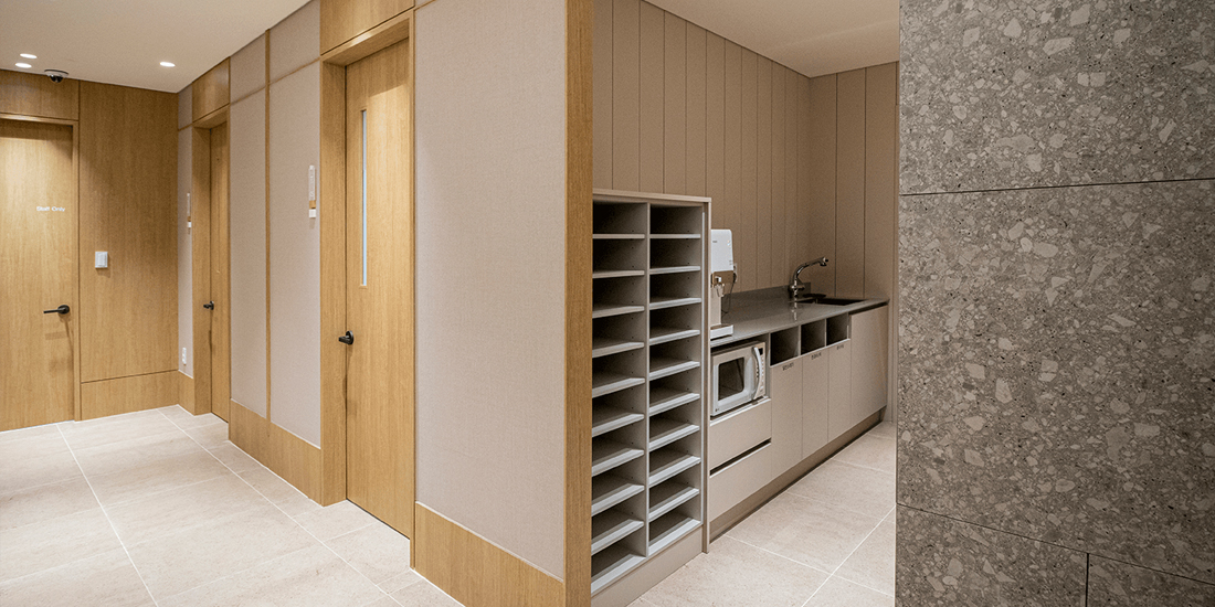캡슐 커피머신, 건식 무릎 사우나기, 바디 프렌드(메디컬 팬텀) 안마의자 등이 구비된 힐링 공간